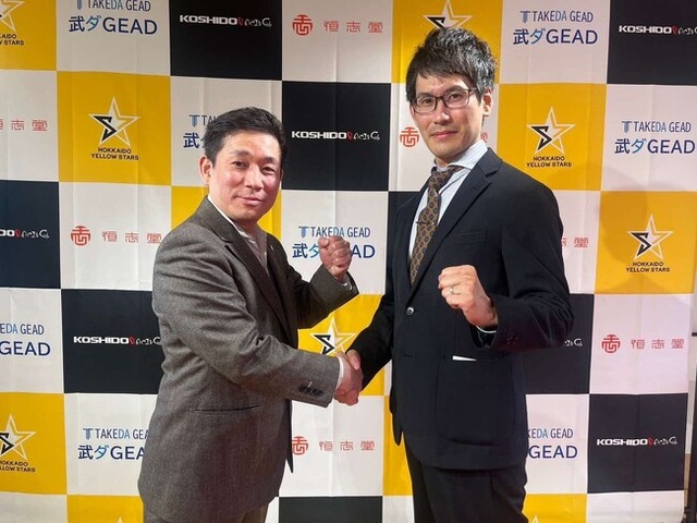 恒志堂 佐藤元春社長と、北海道イエロースターズ 澤野社長(2025年1月20日 記者会見時)