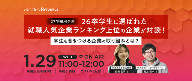 株式会社ワークス・ジャパン(本社:東京都千代田区、代表取締役:清水信一郎)は、2025年1月29日(水)に企業の人事担当者及び人材開発担当者を対象にしたオンラインフォーラム、WORKS REVIEW『27卒採用予測|26卒学生に選ばれた就職人気企業ランキング上位の企業が対談!学生を惹きつける企業の取り組みとは?』を開催します。