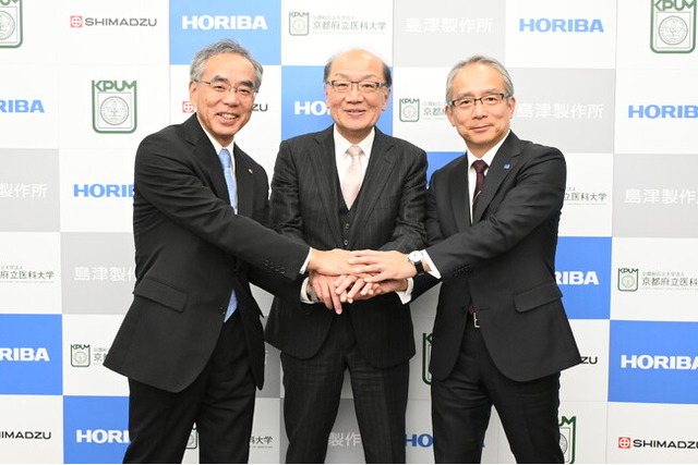 (左から)島津製作所 代表取締役社長 山本靖則、京都府立医科大学 学長 夜久均、堀場製作所 代表取締役社長 足立正之