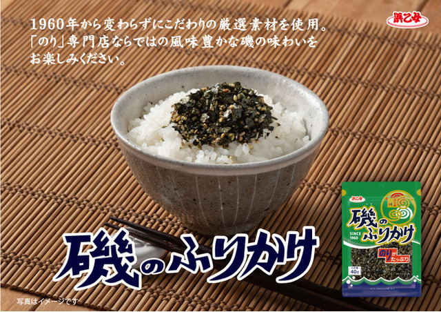 1951年「一枚の味付のり」から始まった浜乙女ブランド。その当時、ふりかけには使用されていなかった「味付海苔」と「ごま」を組み合わせて、1960年に浜乙女初代ふりかけとなる「磯のふりかけ」が誕生しました。発売当初から65年にわたり、豊かな磯の風味とご飯に合う甘辛い味付けで、多くのお客様にご愛顧を賜っているロングセラー商品です。これまで風味やパッケージなど、リニューアルを重ねてまいりましたが、原点である甘辛い味付けに加え、さらに海苔本来の味と風味を追求するため、海苔の配合量を増やして磯の味わいを刷新しました。浜乙女ならではの伝統的な美味しさを大切に守りながら、昨今のレトロブームに寄り添った復刻デザインに仕上げました。懐かしさも感じる新たな「磯のふりかけ」を、ぜひ食卓でお楽しみください。