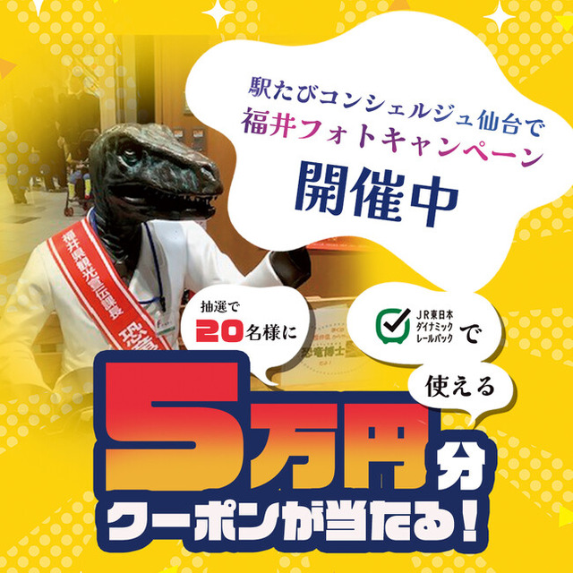 併せて、恐竜博士と一緒に「福井で食べたいもの・行きたいところ」などが書かれたフォトプロップスを持って撮影した写真をInstagramに投稿すると、抽選で福井県への旅行に使える5万円クーポンが当たるフォトキャンペーンを開催しています。