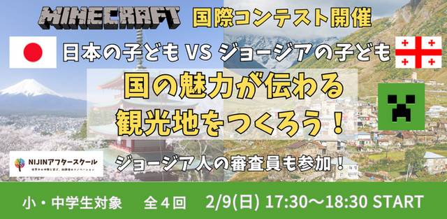 株式会社NIJIN(本社:東京都江東区、代表取締役:星野達郎)が運営する小中学生を対象としたメタバース学童『NIJINアフタースクール』では、マインクラフトプロジェクトの子どもたちがジョージアの子どもたちとの交流イベント【マインクラフト国際コンテスト】を2/9(日)から開催いたします。