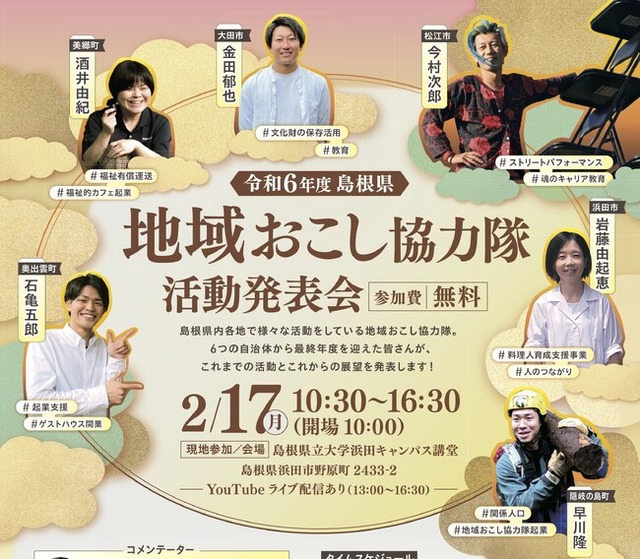 島根県内各地で地域づくりのために様々な活動をする地域おこし協力隊。今回は、松江市、浜田市、大田市、奥出雲町、美郷町、隠岐の島町6つの自治体の活動最終年の隊員たちのこれまでの活動とこれからの展望を発表します。パフォーマンス、文化財活用、料理人、福祉運送、起業、ゲストハウスなど各隊員が取り組んだ多彩な活動やその試行錯誤のプロセスを知る貴重な機会です。現地もしくはYouTubeライブ(アーカイブあり)でご覧いただけますので、ぜひご覧ください。