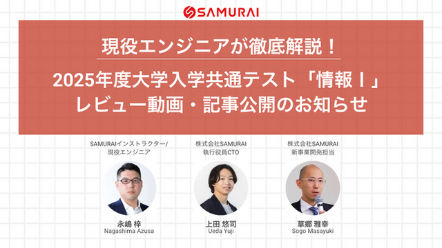 プログラミングスクール「侍エンジニア」を運営する株式会社SAMURAI(本社:東京都、代表取締役社長:羽田 吾立、以下:当社)は、2025年1月19日(日)に行われた2025年度大学入学共通テスト「情報I」について、侍エンジニアの講師であり現役エンジニアでもある永嶋梓、当社執行役員CTOの上田悠司、新事業開発担当の草郷雅幸がレビューを実施し、テストの内容やポイント、次年度の共通テストを受験する生徒たちに向けて「どのような学習が求められるか」を徹底解説しました。