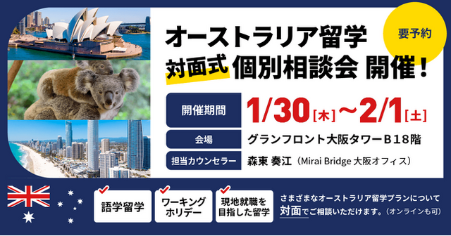 本相談会は、オーストラリア留学を検討中の皆さまに向けた個別形式の対面イベントで、語学留学やワーホリ、現地就職や永住権取得を見据えた留学まで、幅広いご相談に対応いたします。また、対面での参加が難しい方はオンライン参加も可能です。