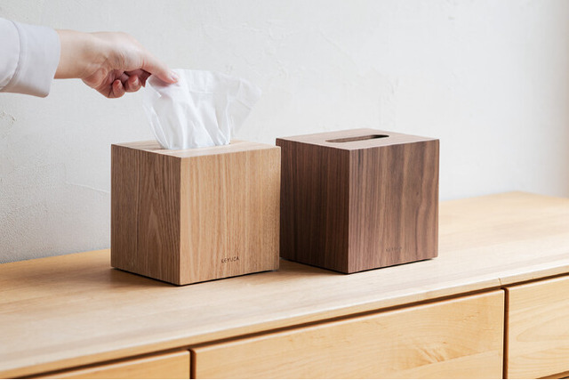 今回の「クラスタ コンパクトティッシュケース」は、シンプルなスクエア型のデザインで、落ち着いたウォルナット色と、明るいナチュラル色の2色をご用意。家具との調和もよく、ティッシュボックスをそのまま置くのは抵抗があるリビングやダイニング、ベッドサイドなどにもぴったり。生活感を感じさせず、さまざまなシーンでお使いいただけます。