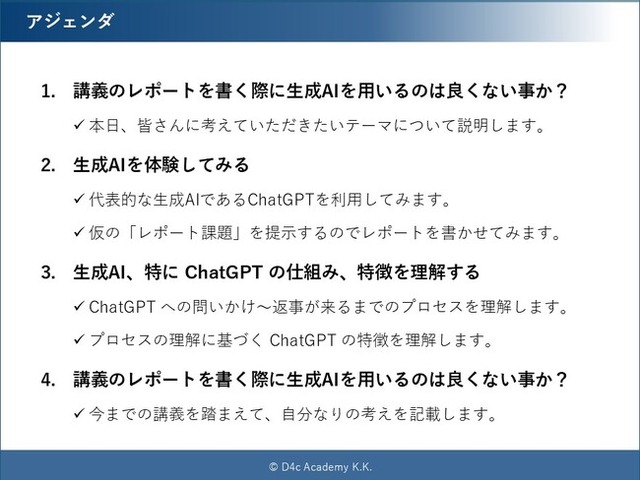 データサイエンスとAI技術の教育・応用に特化した株式会社D4cアカデミーは、2024年11月25日、長崎大学の「情報と社会」講座として、大学1年生を対象に「ChatGPTナビ for School」を提供しました。これは、ChatGPTおよび生成AIがもたらす学習環境の転換期において、どう対応していくのか・適切な活用とは何かを探る取り組みの一環です。