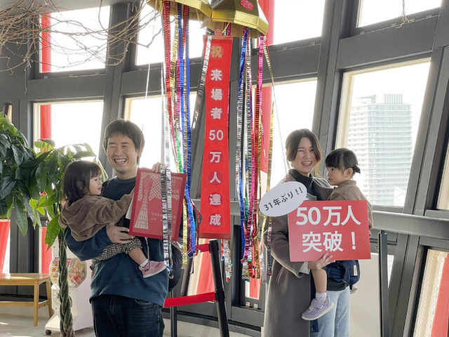 フェリシモが屋上デッキや展望フロア、低層1階エントランスやチケット売り場を運営する「神戸ポートタワー」が1月24日(金)、来場者数50万人を突破しました。2024年4月26日にリニューアルオープンしてわずか9ヵ月のスピード到達となり、午後10時35分ごろに館内でアナウンスされると展望フロアは祝福ムードに包まれました。記念すべき50万人目のお客さまは石川県金沢市からご来場の井口 周人(いのくち しゅうと)さん。ご家族の妻の幸(ゆき)さん、長女の結月(ゆづき)さん、次女の凪彩(なぎさ)さんといっしょに「おとといが長女の誕生日で、そのための旅行として神戸に来ました。まさか50万人という記念すべきタイミングで来れるとは思っていなかったので、とてもうれしいです」としあわせにあふれるご感想をくださいました。短期間での50万人突破にあたり、記念盾や神戸ポートタワーグッズなどを贈呈したフェリシモ神戸ポートタワー事業本部タワーマネージャーの大島彰は「4月のリニューアルオープン後、神戸市内をはじめ全国、あるいは海外から多くのお客さまにご来場いただき、あっという間に50万人に到達し感謝しかありません。震災後30年の節目の年に達成できたことも感慨深いです。引き続き何度でも来ていただけるようなおもてなしを用意してお待ちしています。」とコメントしています。