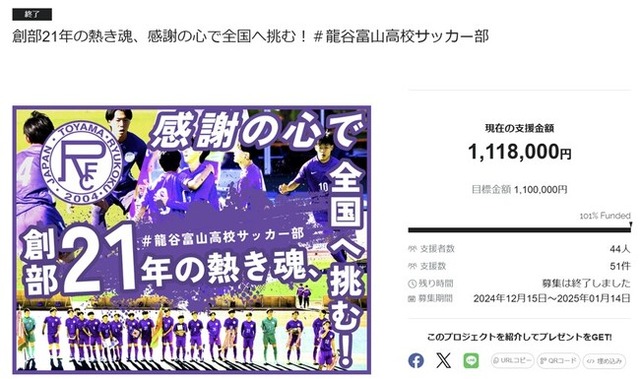 チーム・団体やアスリートを支援するスポーツ専門クラウドファンディングを展開するスポチュニティ株式会社(東京都 中央区、以下スポチュニティ)は、龍谷富山高等学校サッカー部が主催するクラウドファンディングプロジェクト「創部21年の熱き魂、感謝の心で全国へ挑む!」を実施し、支援金額1,118,000円(目標達成率101%)を達成して終了しました。今回得た支援金は、2024年12月28日~2025年1月13日開催の全国選手権大会の参加費用に活用されました。
