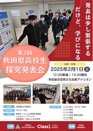SchoolTech事業を展開するClassi株式会社(本社:東京都新宿区、代表取締役社長:竹岡 章、以下Classi)は2025年2月1日に秋田県立秋田中央高等学校(秋田県秋田市、校長:水谷 佳延、以下秋田中央高校)と共催で「第2回 秋田県 高校生探究発表会」(後援:秋田県教育委員会)を実施いたします。
