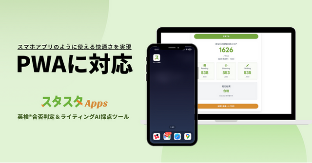 スタディスタジオ株式会社(本社:東京都渋谷区、代表取締役:鈴木孝一、以下「当社」)は、英検(R)受験生向けに提供しているウェブサービス「スタスタApps」をPWA(Progressive Web App)対応いたしました。これにより、スマホ画面にアイコン追加やオフライン対応などの機能が充実し、当社が既に公開している「合否判定ツール」「ライティングAI採点ツール」などを、よりアプリに近い感覚で利用できるようになります。