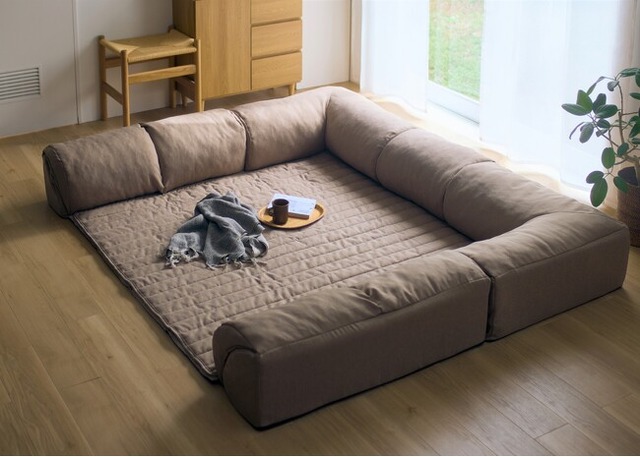コーナータイプは、ラグを囲む二辺に背もたれを付けた圧迫感が無く出入りがスムーズな仕様です。ダブルコーナータイプはラグを囲む三辺に背もたれを付け、より“おこもり感”がある使用感です。こだわりの2層構造で肘置きや枕にもちょうどいい背もたれは、ふんわり気持ちの良いもたれ心地で、リラックスして過ごせます。また、背もたれ部分のクッションをマット部分から取り外し、コンパクトに収納することも可能です。