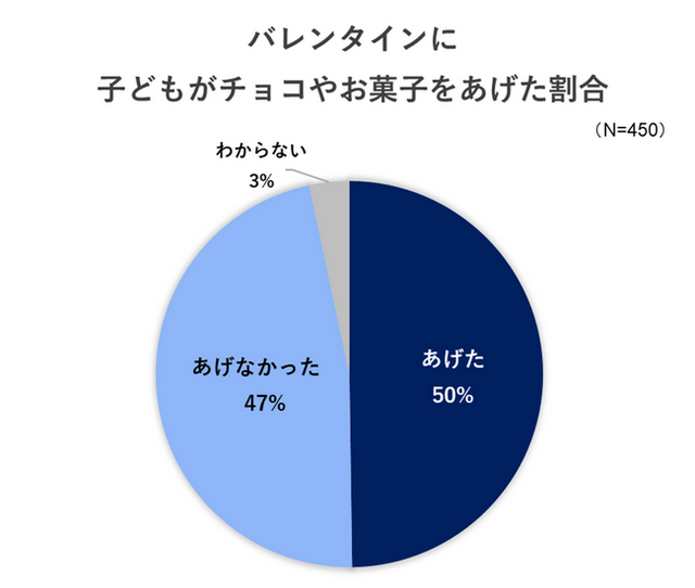 「あげた」が50%で「あげなかった」が47%、「わからない」が3%で、約半数の子どもが昨年(2024年)のバレンタインに、お菓子やチョコをあげたという結果でした。