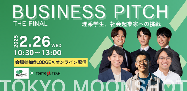 「社会の無関心の打破」を理念とする株式会社Ridilover(所在地:東京都文京区、代表取締役:安部敏樹、以下「リディラバ」)が運営する、社会課題解決インキュベーションプログラム「TOKYO MOONSHOT(トーキョームーンショット)」は、2月26日(水)に開催される「TOKYO MOONSHOT ビジネスピッチ ザ・ファイナル( https://business.form-mailer.jp/lp/b5cf17f3273892 )」の一般申込の受付を、本日1月27日(月)より開始します。当イベントでは、投資家、スタートアップ事業者および支援者を審査員として招き、TOKYO MOONSHOTに参加する理系学生のビジネスプランに対するフィードバックをもらい、全5名の審査員の得票数によって最優秀賞が決まるアワードを実施します。また、「官民共創によるインパクトスタートアップ・エコシステムのあり方とは。(仮)」をテーマとしたスタートアップ創出にまつわる多様な立場の方々によるトークセッションを実施します。