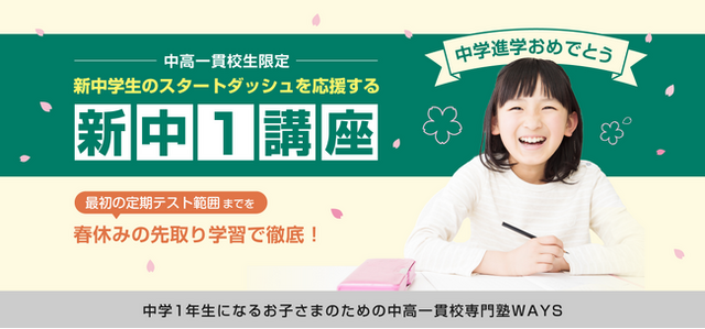 株式会社メイツ(本社:東京都新宿区 代表取締役:遠藤尚範)が運営する『中高一貫校専門 個別指導塾WAYS(以下、WAYS)』では、2025年1月28日(火)より中高一貫校へ進学する方を対象とした新中1講座のお申し込み受付を開始いたしました。併せて、入塾金(税込22,000円)の半額キャンペーンを実施します。