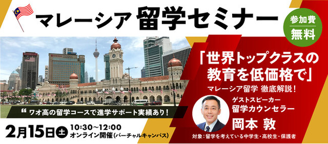 2回目となる2月15日(土)は「マレーシア留学セミナー」です。マレーシアは欧米諸国への留学に比べて費用が安く、世界大学ランキングでも数多くの大学がランクインするなど教育水準が高いのが特長です。また、大学によっては、マレーシアにいながらオーストラリアやイギリスの大学の卒業資格を得られる仕組みもあります。今、留学先として注目が高まっている国の一つです。