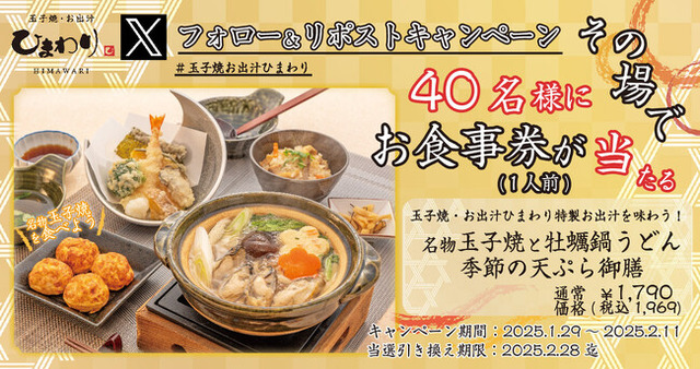 この度、玉子焼・お出汁ひまわり公式Xアカウントとフォロー&リポストして応募すると、抽選で40名様に「名物玉子焼と牡蠣(かき)鍋うどん 季節の天ぷら御膳1人前(税込み1,969円)」をお召し上がりいただけるデジタルお食事券プレゼントキャンペーンを2025年1月29日(水)より開催します。この機会にぜひご応募ください。