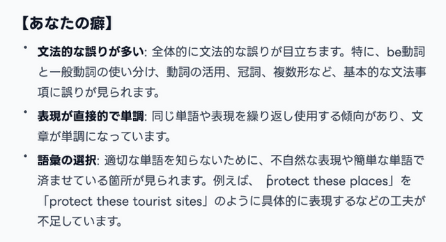 → 今回の改修で、自動詞と他動詞の使い分けに特化した指摘を行い、受験生が「目的語を伴わない動詞」と「目的語が必須の動詞」を整理しやすくしました。文法書を見るだけでは気づきにくいこのポイントに対して具体的な修正提案が提示されるため、作文品質の向上が期待できます。