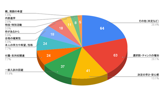 多くの人が利用を検討している推薦入試ですが、その希望・検討理由として多かったのは「選択肢・チャンスの増加」「決定の早さ・安心感」でした。一般入試よりも合否の結果が早く分かることや、推薦入試でチャレンジした大学に一般入試でも出願できるといったメリットに魅力を感じている人が多いことが分かります。また「スポーツで頑張ってきた成果を活用したい」のように「特技・特別活動」を理由に挙げている人が3.5%、「一発勝負は本人に向かないと思う」のように「本人の学力、希望、性格」の要素を理由に挙げている人も7.7%と少なからず見られました。本人の個性や強みを活かせるのも推薦入試のメリットだと言えます。総じて、推薦入試は進路実現に向けた選択肢のひとつとして幅広いニーズに応える受験形態であると分かりました。