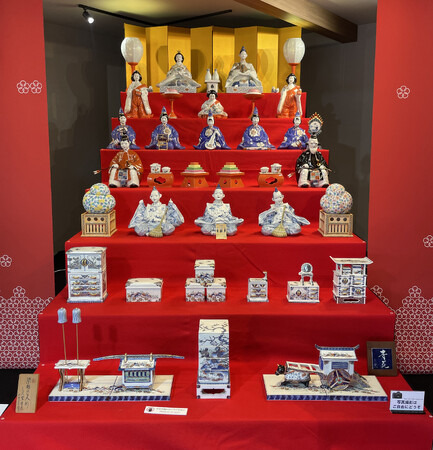 「第1回有田雛のやきものまつり」にお披露目された、伊万里・有田焼業界で初めて作られた七段飾りです。ほのぼのとした表情のお雛様をじっくりご覧ください。