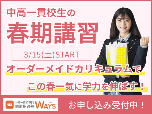 中高一貫校専門 個別指導塾WAYSの春期講習では、過去単元の総復習や休み明けテスト対策、さらには大学受験に向けた基礎固めから直前対策まで、一人ひとりの目的に合わせたカリキュラムをご用意しています。