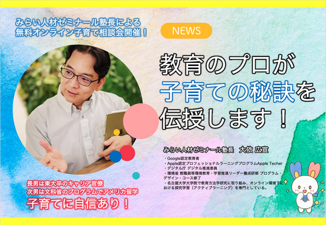 みらい人材ゼミナール合同会社(本社:愛知県北名古屋市/代表:大依広宣)は、教育のプロフェッショナルによる子育て相談会をオンラインで開催します。
