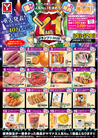 『Y-1GP(ヤマワングランプリ)』『F-1GP(フランテナンバーワングランプリ)』は、2月3日(月)から2月20日(木)の購入対象期間にノミネートされたバイヤーのおすすめ商品をお買い上げいただき、販売数量が一番多かった商品=人気No.1商品を決定する特別企画です。1位に輝いた商品を購入していただいたグラッチェカード会員様に抽選で、総額500,000円分のポイント&電子マネーをプレゼントいたします。