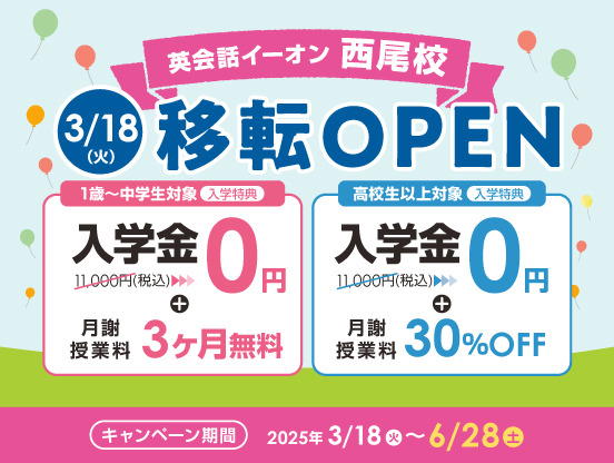 オープンにあたり「英会話体験無料特別イベント」及び「移転オープンキャンペーン」を実施いたします。