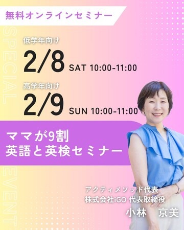 本セミナーでは、アクティメソッド創設者であり、株式会社iGO代表取締役も務める小林京美が、長年培ってきた英語教育のノウハウを惜しみなくお伝えします。