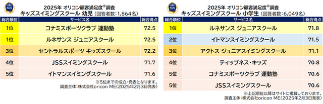 実際のサービス利用者を対象に第三者の立場で顧客満足度調査を実施する株式会社oricon ME(本社:東京都港区 代表取締役社長:小池 恒 略称:オリコン)は『キッズスイミングスクール』についての満足度調査を実施し、2025年2月3日(月)14時にその結果を「オリコン顧客満足度(R) 」公式サイト内( https://life.oricon.co.jp/ )にて発表いたしました。結果は以下の通りとなりました。