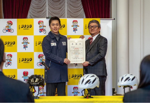また2024年より大阪府民に自転車の安全利用やヘルメット着用等を啓発する取り組み「ジテシラProject」に協力しています。その一環として、2024年12月、大阪府教育委員会に約2000個の自転車用ヘルメットを寄贈。それをうけて2025年1月29日に府庁本館の正庁の間において、大阪府・吉村洋文知事出席のもと「自転車ヘルメット寄贈式および感謝状贈呈式」が執り行われました。
