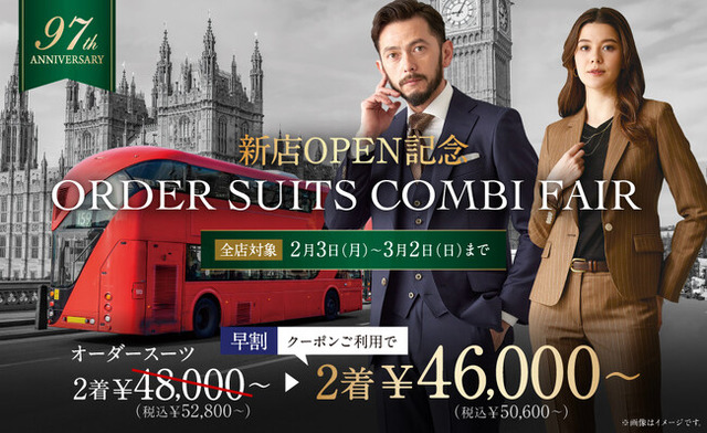 オーダースーツ専門店「グローバルスタイル」を運営するグローバルスタイル株式会社(東京証券取引所 スタンダード市場:7126、本社:大阪市中央区、代表取締役社長 田城弘志)は、2月3日 (月)から3月2日(日)までの期間中、対象プランご利用で、オーダースーツが2着¥46,000~(税込¥50,600~)になるフェアを全39店舗で開催いたします。