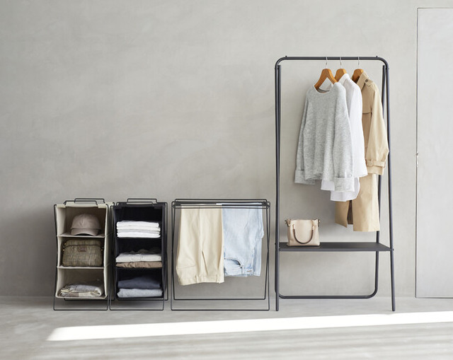 「3段ファブリックシェルフ」はシャツや帽子など種類ごとに分けて衣類を収納することができ、正面から簡単に取り出すことができます。「ボトムスワイヤーラック」は1つで「掛ける、置く、吊るす」の3通りの使い方ができ、ボトムスを掛けて収納することはもちろん、小物を置くなど、お好みに合わせた収納が可能です。「たためるハンガーラック」は洋服をかけて収納でき、取り外し可能な棚板付きで、棚上や棚下にもたっぷり収納できます。