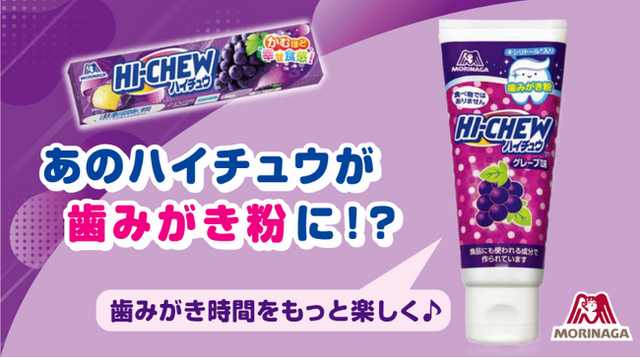 この度商品発売の第一弾として、「ハイチュウ<グレープ>」の風味を再現した「ハイチュウ歯みがき粉」を発売し、アタラシイものや体験の応援購入サービス「Makuake(マクアケ)」にて、2025年2月7日(金)14時より応援購入者の募集を開始します。「ハイチュウ歯みがき粉」は、歯みがき時間が楽しくなるようにとの想いを込めて、2年半の歳月をかけて開発しました。