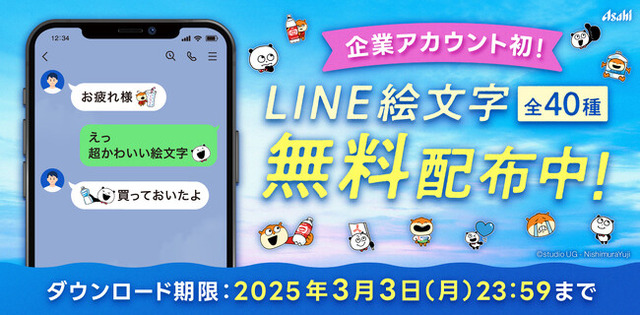 アサヒ飲料株式会社(本社 東京、社長 米女太一)は、人気クリエイター「にしむらゆうじ」のキャラクター「ごきげんぱんだ」「こねずみ」とコラボレーションした「LINE絵文字」プレゼントキャンペーンを2月4日から3月3日までの期間限定で実施します。