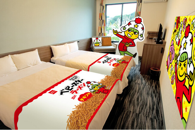壁、ベッド、クッションなどをベビースターの麺柄やベビースターキャラクター「ホシオくん」のフォトパネルがお出迎えしてくれる、ベビースター尽くしの客室に仕上げました。本コンセプトルームご宿泊のお客様には、おやつにもおつまみにもピッタリなベビースターラーメンが食べ放題となる他、自分用にもお土産にもなるベビースタ―オリジナルグッズもご用意しました。クッションの麺柄の中には、ベビースターで描かれたメッセージが隠されていて遊びゴコロ満載の客室。非日常の中に登場したちょっと変わったベビースター装飾とお土産で、訪れた記念を写真とともに記憶に残したくなること間違いなし!