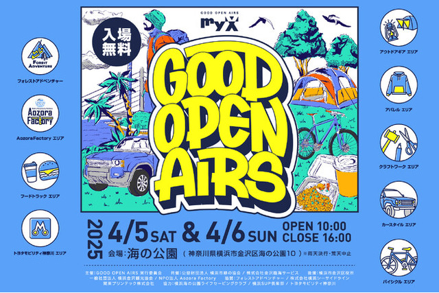 GOOD OPEN AIRS 実行委員会(運営事務局:神奈川トヨタ自動車株式会社 myX事業部内)は、2025年4月5日(土)・6日(日)の2日間、横浜・海の公園でアウトドアイベント「GOOD OPEN AIRS 2025」を開催いたします。