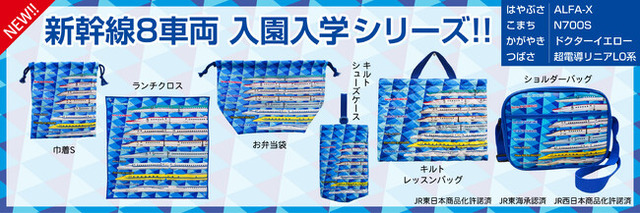 JR東日本、JR東海、JR西日本の人気の新幹線が8車両そろったデザイン(N700S・923形ドクターイエロー・E5系はやぶさ・E6系こまち・E7系かがやき・E8系つばさ・ALFA-X・超電導リニアL0系)が巾着S、ランチクロス、巾着お弁当袋、キルトシューズケース、キルトレッスンバッグ、