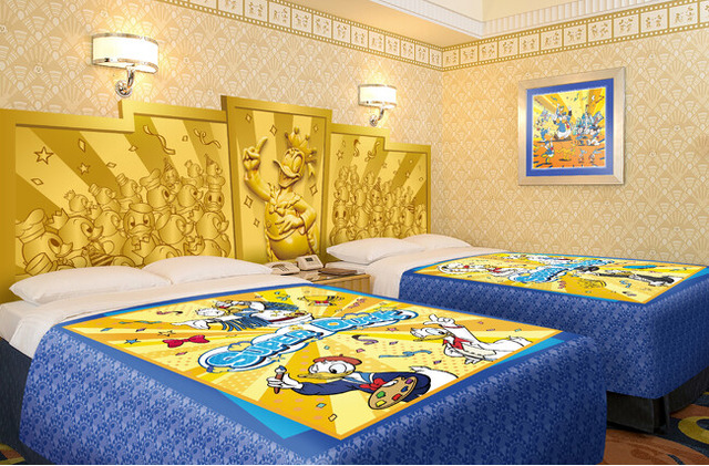 スペシャルルームには、ダックシティの中でキング・オブ・スーパースターになった愉快なドナルドのモチーフがい たる所に散りばめられています。ドナルドがたくさんのクワッキーダックたちに囲まれているデザインのヘッドボード やミッキーマウスと仲間たちがドナルドを褒めたたえている様子を描いた壁掛けアートなど、ダックシティのにぎやかでユニークな世界が広がります。ベッドスローも普段のミッキー形のデザインから王冠をかぶったドナルド形のデザインへと様変わりし、スペシャルルームでの滞在を盛り上げてくれます。