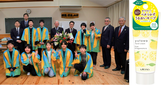 当商品は、北川村の子どもたちの「村を盛り上げたい!」という想いのもと、化粧品会社のウテナ、ドラッグストアのウエルシアグループが協力し、共同開発した商品です。廃棄されるほかなかった”ゆずの種”から抽出した「ユズ種子油」を保湿成分として配合しており、多くのお客様からご好評いただいています。