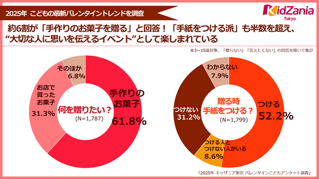 調査では、3~15歳のこどもの61.8%が「バレンタインに手作りのお菓子を贈る」と回答。また、「贈る時に手紙をつける」と回答した割合も半数を超え、「手紙をつけて贈る相手もいる」の回答を含めると6割に。こども達は、お菓子を手作りして贈ったり、手紙を書いて添えるなど、大切な人に思いを伝えるイベントとして、バレンタインを楽しみにしていることが分かりました。