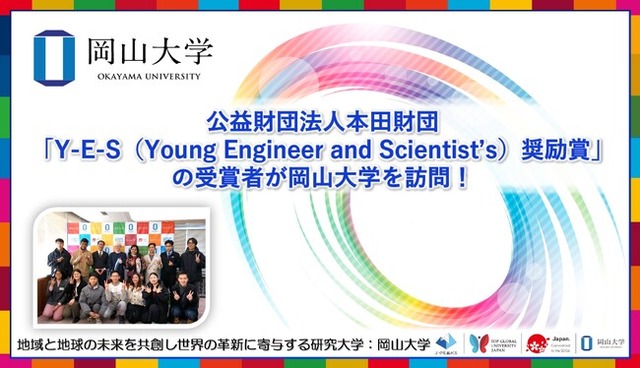国立大学法人岡山大学(本部:岡山市北区、学長:那須保友)は、2025年1月20、21日に、公益財団法人本田財団(※1)の「Y-E-S(Young Engineer and Scientist's)奨励賞」(※2)の受賞者13人が、日本の科学技術への知見を深める研修のため来日し、その一環で本学を訪問しました。