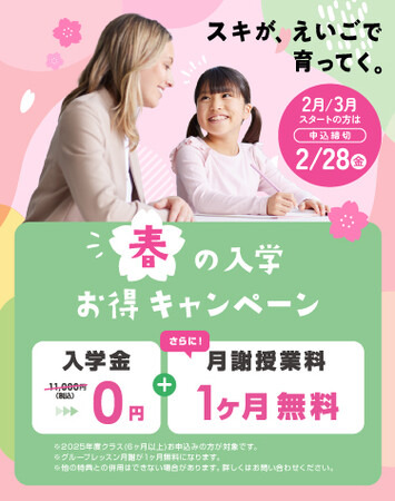 また、2月1日(土)~4月28日(月)の間にイーオンキッズにご入学いただいた方は、入学金無料および月謝授業料1ヶ月分無料が適用されるキャンペーンも実施しています。