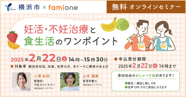 「子どもを願うすべての人によりそい 幸せな人生を歩める社会をつくる」をビジョンに掲げ、法人の従業員向け福利厚生や自治体の住民向け支援を行うヘルスケアサポートサービス「ファミワン」 https://famione.com/benefit/ などを展開する株式会社ファミワン(本社:東京都渋谷区、代表取 締役:石川 勇介、以下当社)は、神奈川県横浜市(市長:山中竹春、以下横浜市)の「ヨコハマ妊活SNS相談事業」委託事業の一環として、2025年2月22日(土) 「妊活不妊治療と食生活のワンポイント」をテーマにオンラインセミナーを開催いたします。
