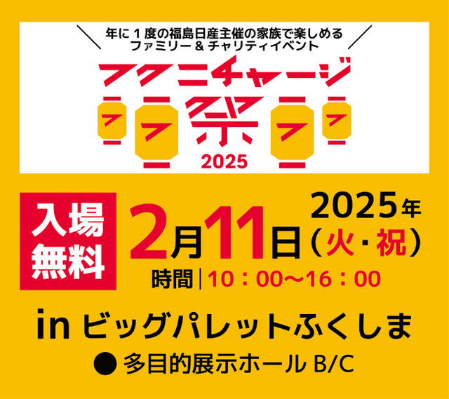 福島日産自動車株式会社(以下福島日産と略、本社:福島県福島市、代表:金子 與志幸)は、福島日産 PRESENTS チャリティ&ファミリーイベント 「フクニチャージ祭2025」を2025年2月11日(火・祝)にビッグパレットふくしまにて開催します。福島を元気にするスペシャルゲストやパワーアップした企画が盛りだくさん!ぜひ会場でお楽しみください!