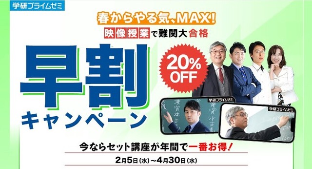 株式会社 学研ホールディングス(東京・品川/代表取締役社長:宮原博昭)のグループ会社、株式会社 Gakken(東京・品川/代表取締役社長:南條達也)は2025年2月5日(水)より、オンライン映像授業による難関大受験対策講座「学研プライムゼミ」において、年間最安値でセット講座が購入できる「早割」キャンペーンを開始いたしました。