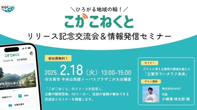 本サービスのリリースを記念し、こがこねくとを活用して情報発信、情報交換していきたいという皆様に向けた交流会&情報発信セミナーの開催も決定しております。