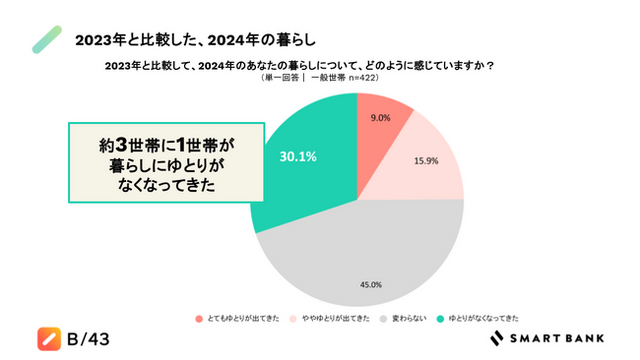 2023年と比較して2024年の暮らしについてどう感じているかを質問したところ、「とてもゆとりが出てきた」が9.0%、「ややゆとりが出てきた」が15.9%、「変わらない」が45.0%という結果になりました。「ゆとりがなくなってきた」と回答した人は30.1%となり、約3世帯に1世帯が「暮らしにゆとりがなくなってきた」と実感していることが分かりました。