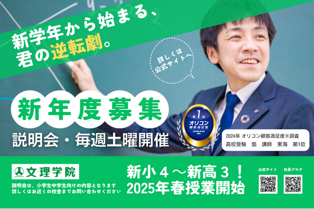 株式会社 学研ホールディングス(東京・品川/代表取締役社長:宮原博昭)のグループ会社、株式会社文理学院(山梨・都留/代表取締役社長:小倉勤)は、新年度生を募集中です。2024年オリコン顧客満足度(R)調査 高校受験 塾 東海ランキングで講師1位となった学習塾が今年も3月から新年度授業をスタートさせます。公式SNSやウェブページでも情報公開中です。