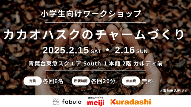 ソーシャルグッドマーケット「Kuradashi」を運営する株式会社クラダシ(本社:東京都品川区、代表取締役社長CEO:河村晃平、以下「クラダシ」)とfabula株式会社(本社:東京都大田区、代表取締役CEO:町田紘太、以下「fabula」)は、2月15日と2月16日の2日間、青葉台東急スクエアにて、小学生を対象としたカカオ豆の皮「カカオハスク」を活用したチャームを作るバレンタインワークショップ(先着順・事前予約制)を開催いたします。本ワークショップは、株式会社明治(本社:東京都中央区、代表取締役社長:松田克也、以下「明治」)にご協力いただきます。